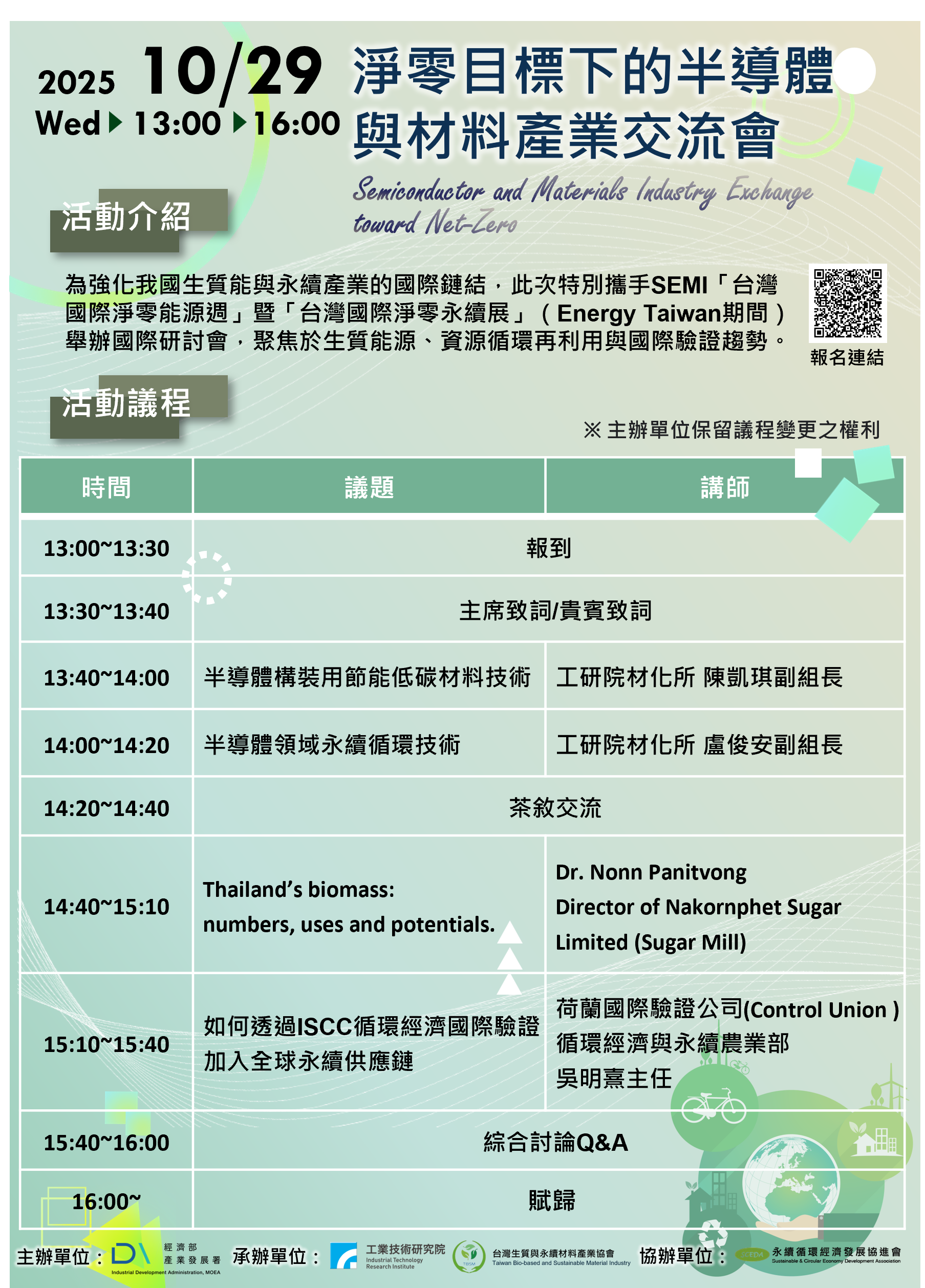 為強化我國生質能與永續產業的國際鏈結,此次特別攜手SEMI「台灣國際淨零能源週」暨「台灣國際淨零永續展」(Energy Taiwan期間)舉辦國際研討會,聚焦於生質能源、資源循環再利用與國際驗證趨勢。